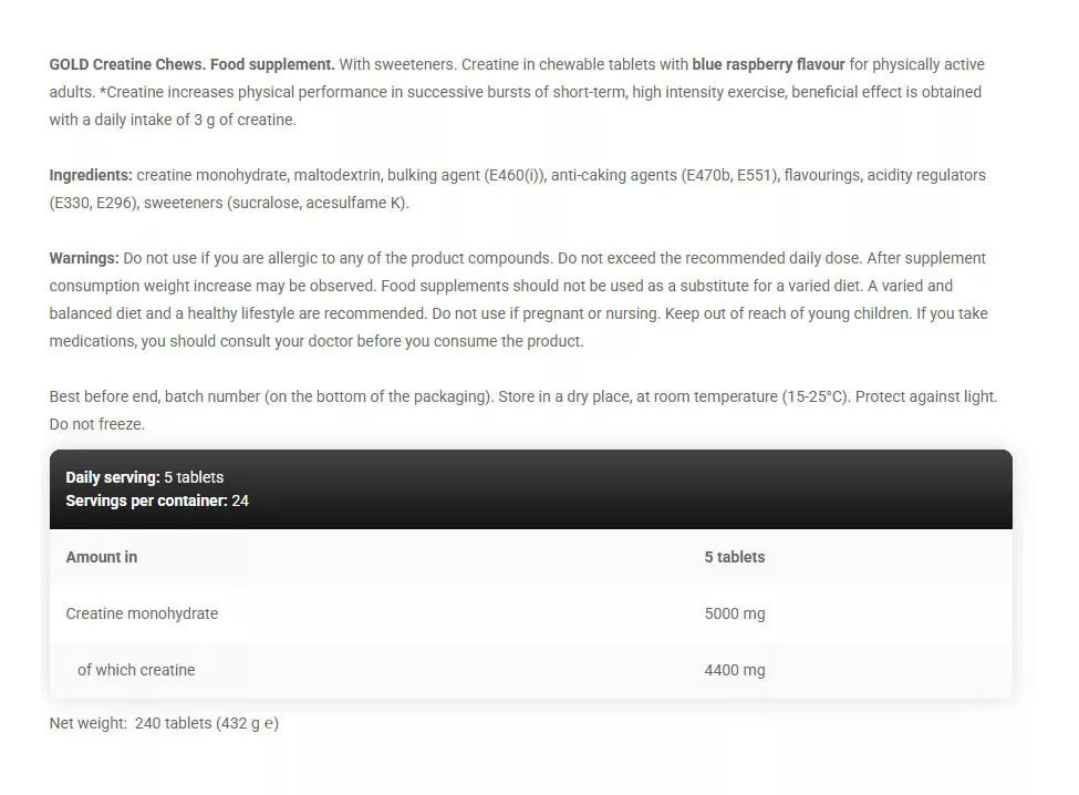 Creatine in chewable tablets with Blue Raspberry flavour for physically active adults.