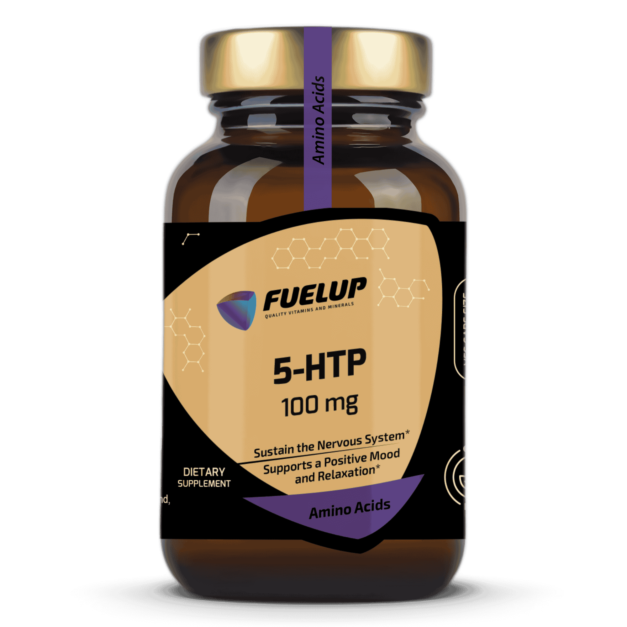 Hver Fuel Up bøtte indeholder 60 kapsler, af 100 mg 5-HTP.